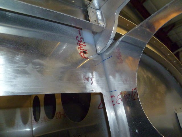 The splice plate and hinge supporting structure are clecoed down tight. Then a drill is run through the fuselages hinge pin holes and on into the hinge. This makes a mark where the hinge pin hole should be drilled.